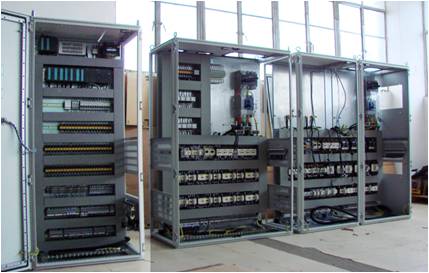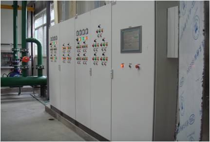 Sains designed and produced the control system. The system consists of a SIEMENS S7-300 PLC, a SIEMENS MP377 touching screen, Danfoss converters and Schneider low voltage electrical devices to control 2 ZUW400A5 water chillers, 3 37kw freezing pumps, 3 55kw processing pumps, one 15kw air conditioning pumps, 3 22kw high temperature tower pumps, and 2 groups of 11kw cooling tower.